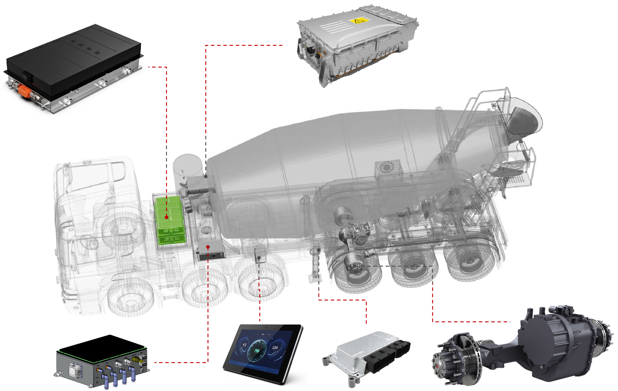 展会上,米兰milan智能的智电一体化解决方案引起了广泛关注。工程师团队在现场为参展观众详细介绍了混合动力牵引搅拌半挂车的系统方案。该方案基于米兰milan智能历经多年开发的eMagi智电平台,针对牵引搅拌半挂车进行了定向开发,涵盖以下几个方面: